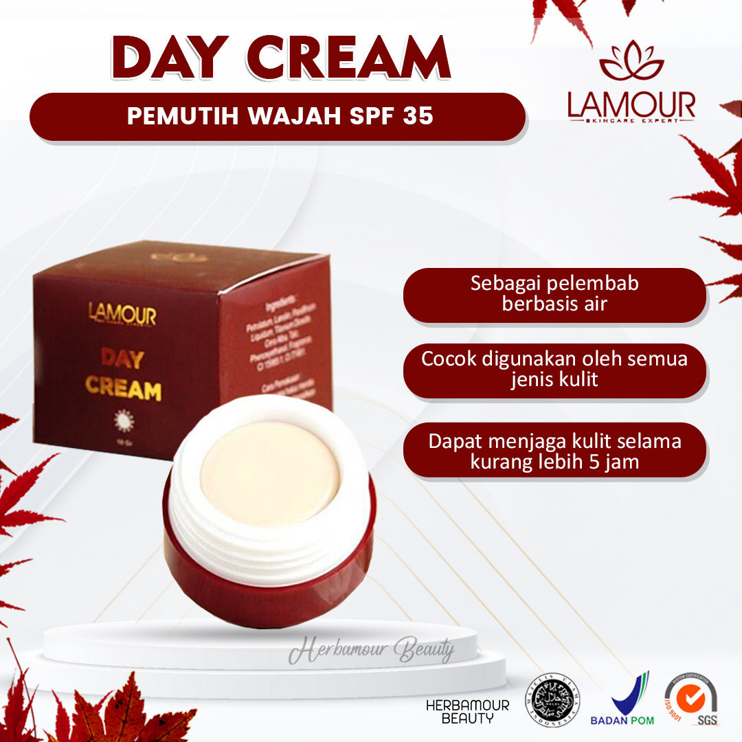 DAY CREAM LAMOUR sebagai pelembab berbasis air serta cocok digunakan oleh semua jenis kulit...